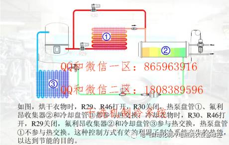 启动压缩泵,电磁阀同时打开,使冷凝收集器中的液态制冷剂通过膨胀阀流入蒸发器;处于高压下的液态制冷剂通过膨胀阀时,由于突然膨胀,使压力下降,也就降低了制冷剂的沸点,因此,制冷剂快速气化,制冷剂在气化过程中从蒸发器周围吸收大量的热能,从而达到制冷的目的。膨胀阀在工作过程中又控制着制冷剂的流量,它既感受蒸发器出口的温度,又感受蒸发器出口的压力,来控制阀的开度。经过蒸发,气化后的制冷剂被压缩机吸入,压缩后,经过电磁阀进入冷却器中,由于压缩的原因,使制冷剂的温度上升,在通过冷却器时,热量被空气道内的循环空气带到滚筒,给需要烘干的衣物加热。此时,制冷剂被冷却,并流入冷凝收集器。当衣物烘干后,进入衣物冷却阶段时,电磁阀关闭,电磁阀打开,经压缩后的制冷剂直接进入冷凝收集器,由冷凝水进行降温。